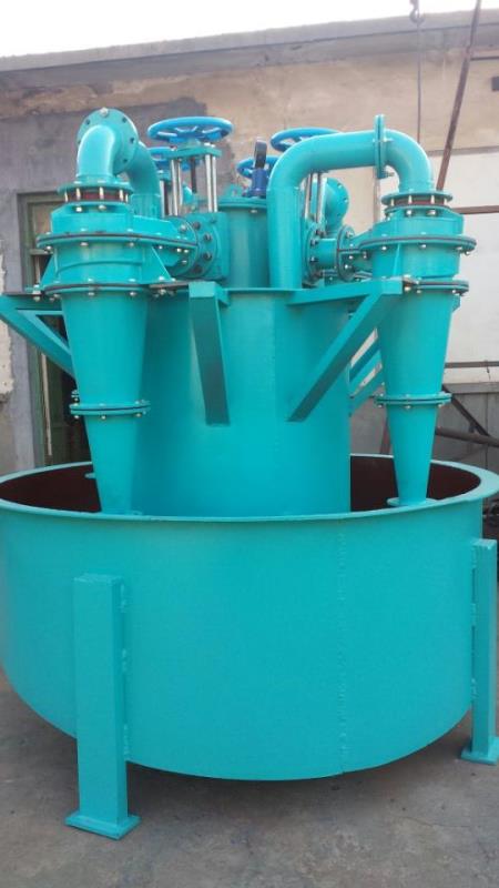 給料料漿在壓力作用下沿線方向進入旋流器,在離心力場作用下,大顆粒被拋向器壁,隨外旋流向下運動,從下部沉砂口排出,得到粒度粗的沉砂產物,細顆粒隨內旋流向上運動,從上部溢流管得到粒度細的溢流產物。
